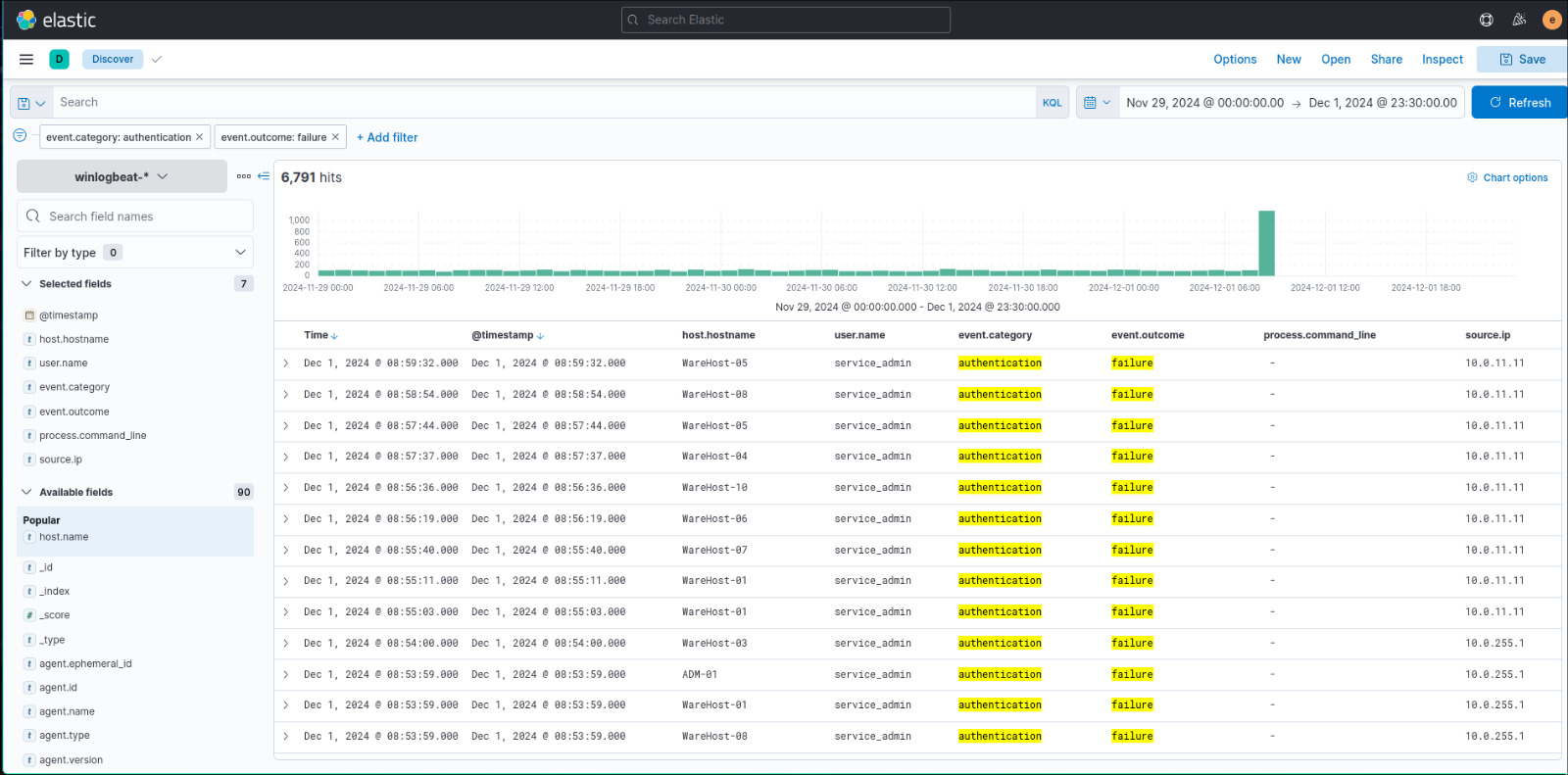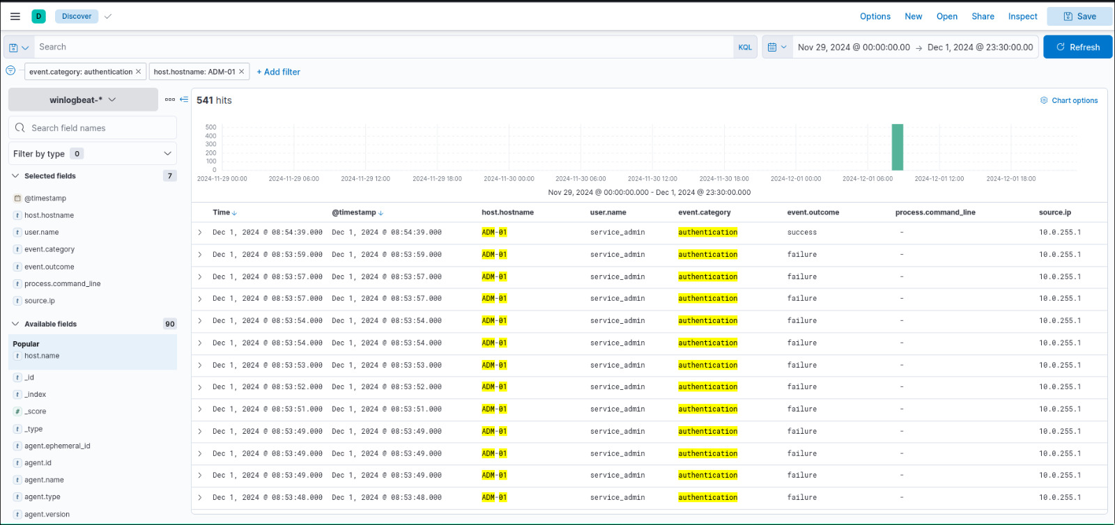 We filter by event.category = authentication and host.hostname = ADM-01 and we see that the latest successful login was on Dec 1, 2024 08:54:39.000