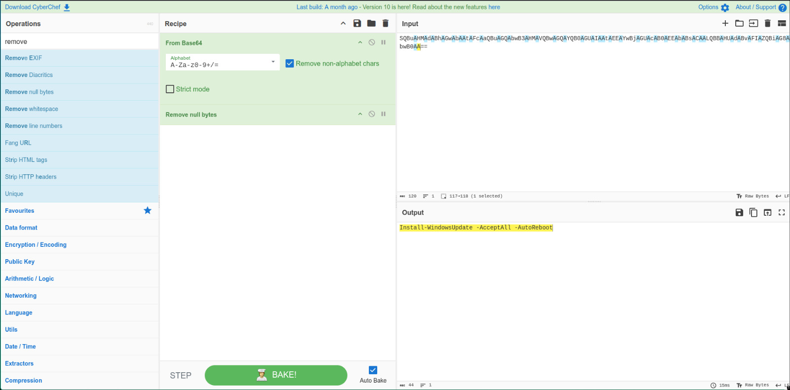 We see the payload for any of the commands executed and after converting from Base64 and sanitization, we make it out to be Install-WindowsUpdate -AcceptAll -AutoReboot.